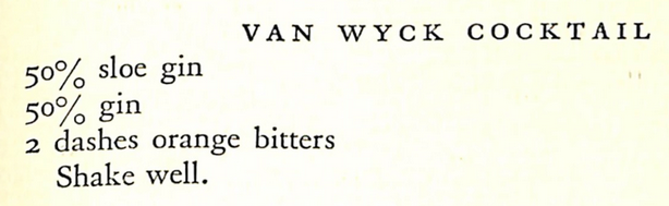 Shake well with ice, strain into cocktail glass, serve. — This frothy yin-yang Duo of strong and syrupy hanging in dubious balance, strapped together with a cord of faint but deep orange bitters, first appears in Straub 1913 with “dry gin.” In JM 1916 it becomes the second of three “Vans” in the cocktail section of Grohusko’s, also specifying dry gin. This agreement suggests the Waldorf Bar as the common source, which is tentatively confirmed by reference to the Old Waldorf Bar Book (1931), where the drink appears with Old Tom gin and sloe gin in a 2:1 ratio, with the orange bitters, stirred, with “fruit in glass.” It was apparently to be drunk in the Van Wyck tunnel.